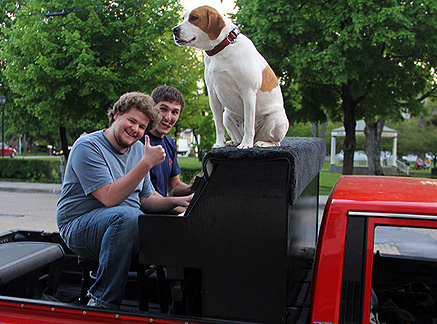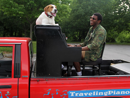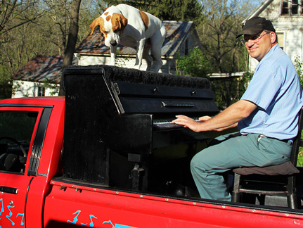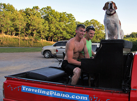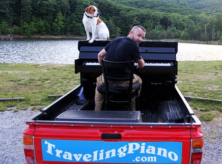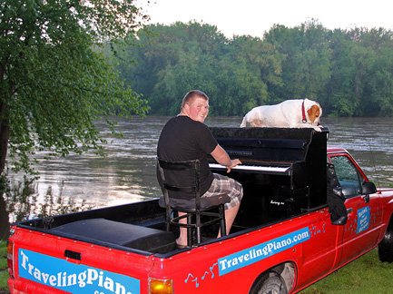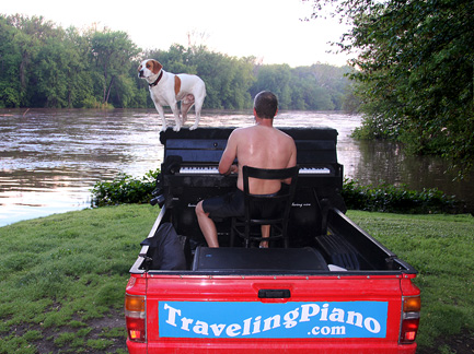 Last night I did some "Down Dog" as in the yoga position and I think I sprained my right hand because of my weight! Ha, whatever... it didn't affect my piano playing thank god. It hurts if I turn it the wrong way. Even though I don't want to admit it I have rain paranoia. Need to remember at this time of year it can rain some every day. In the local park near where we are staying there is a covered picnic type house. I pulled the Traveling Piano up to it so that if there was a sudden down pour we could pull the truck in under it. There was just enough height room and hopefully we would not get caught by the park ranger. No rain. When I'm creating music these days and I play in a piano key crack I have been developing the habit to think of the word "care." Not thinking of what I'm doing when I create music can lead to playing in a lot of cracks. I want to care more. Perfection, can I achieve it, do I want to... naa, but I do want to get better and be just a little bit more conscious.
