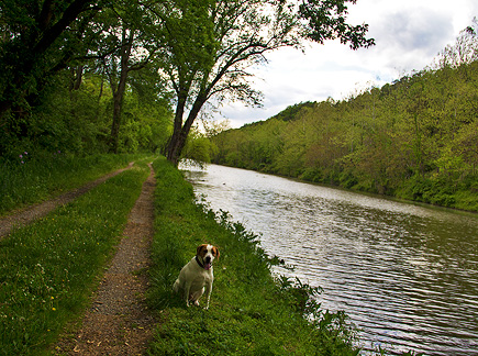 I was in heaven again. Creating music all by myself with Mo hanging out under the trees on a canal filled with water, a path of greenery, mountains, trains passing across the river... there was a bike path; we took a walk. It was full of wild flowers. We ended up in Oldtown, Maryland. There was a toll bridge, it cost a buck fifty to cross on wooden boards and is open only when the water is low enough. It had a toll booth with an employee who said some lady in Winchester, Virginia owns the bridge. Most people have no idea how many road bridges are privately owned. I used to think they were all government owned because they are connected to public roads. There are thousands in the US and they can rake in allot of money for the owners. I drove farther then I wanted today but it was worth it. This may be the most enjoyable spring I've ever had.