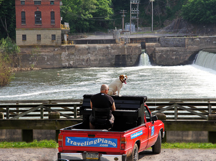 The energy in the store felt really good and the guy making the sandwich was super friendly so I brought the Traveling Piano around to the front doors and started playing the piano while Sherrie went inside and coerced him out for a few musical notes and a picture. The sandwich cost $2.50! Apple pies, $4.00. Can you believe that? I got three sandwiches and a pie for both Sherrie and myself, ha! Afterwards we headed to a place called Dam Five along the C&O canal. A huge dam/park area which was really beautiful but it was so hot and humid with no shade and I got sunburn on my bald head because of course I forgot the idea of suntan lotion with so much action going on and me dizzy as a... whatever from the sun, heat and lack of sleep.