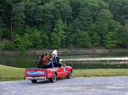 It was raining when I woke up at 10am. With a headache (humidity and pollen) I went back to sleep until 2:30 pm. In a semiconscious dream state I remember short random insignificant musings with people I have known throughout life. It reminded me that everything that has ever happened is floating around and ever present. The sun came out an so off to the park we drove. There were people we had met before hanging out. There was a dog for Mo to play with, guys fishing... The wind was fairly strong so the energy was high. I was completely rested. Everyone left. The wind was blowing in a different direction than usual. It was from behind. The leaves on the trees sounded like water running. The music carried in new ways and directions. A couple drove up to tell that they could hear the music while hiking up along the mountain top, far away.