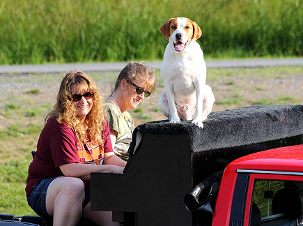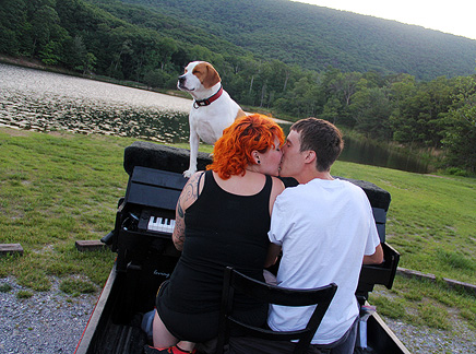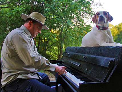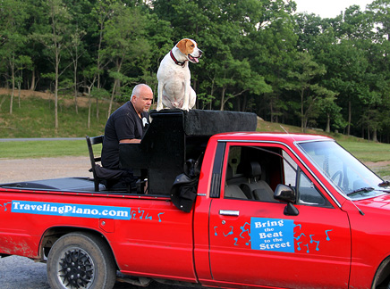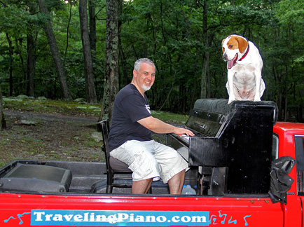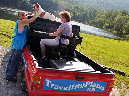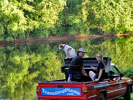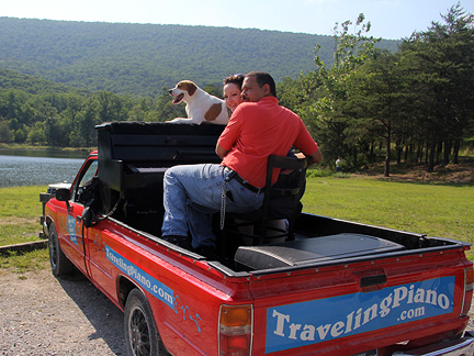 Into the park we drove. I did not expect anyone to be there but there were lots of fisherman. A bunch of guys were friends... as back woods as it can get and they seemed to know about the Traveling Piano. Mo ran off so I went and hid by a rock in some high grass. When he leaves my sight I use that for practice in his being able to find me should we ever get separated. Mo ran by me both sides about three feet away looking but did not see me. I was amazed because I was in full view. He was running on nose power, totally. Thats the hound dog in him. As soon as he put his nose in the air I knew he found me and he came running straight into me. When I got back to the truck one of the fisherman warned me to stay away from the rocks and then showed me a picture of what he had found in the area last week. He and a few friends turned over one rock, and there were both rattlesnakes and copperheads in the same spot. Nine in total!!! Some places like in Florida and Australia people learn to live side by side with crocodiles. Now, here its snakes big-time. As I was leaving they turned around and thanked me for the music. I can't tell you how good that made me feel. My stereotyped upbringing would have said they were too gruff, uneducated, dirty with too much male macho to be so appreciative and respectful in front of each other. I always knew the stuff I was told about people "not like us" was a bunch a crap. All the stereotyping of people bred into me as a child and young adult... I think this journey is partly to prove it all wrong for the world.