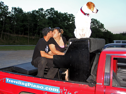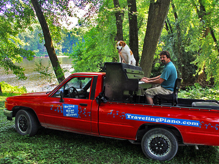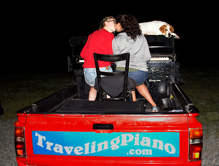 A friend pushed my rage button today. He sent me an email saying he saw this guy with his piano and dog in Arizona on the street performing and he had a bucket out for tips and it looked like he had enough money for a cheap room for the night and to get a meal. He suggested that if I... "swallowed my pride" by accepting tips that might help me get to China and I'd still be giving joy to people." I emailed him back and said... "Who the fuck are you talking to about pride my friend?" Ha, button pushed! First I know the guy traveling with his piano and dog, he's a busker. (collects tips to get by) Thats great for him. It is not what I do, have ever done or have ever had an interest in doing. Why would I collect dollar bills for a scummy hotel room and scrap by for a meal when I can extract performance fees for what I do as I did my entire life and own my own house and eat as many meals of whatever I want as a result. When someone says to me... "you know those tip jar dollar bills add up." I say........ " No, those tip jar dollar bills do not add up." Pennies don't add up... dollar bills don't add up... five dollar bills don't add up unless you want to work your ass off twelve hours a day and consider it a minimum wage. This is 2013 people! I remember back in the seventies how I would tip waitresses double at a local center city diner because the place was always full of old people who were tipping fifty cents for their meals like it was a hundred bucks! Reminding people, trying to help people understand what I do and the benefits, takes allot of patience. Sometimes I just lose it. Of course I want people to give me money but... just not give because I'm looking for it or asking for it. A lot of the magic people experience from what the Traveling Piano contributes to the world is because it is all being given unconditionally. There is no angle, no hidden agenda, no expectation, obligation, etc... If people want to give me money they will do it wether there is a tip jar present or not. That is a fact. Otherwise they think its because they should or... or I have a need to get a scummy room or something. As far as collecting money as in busking while also giving joy... I can work for Walmart while giving joy to people, I've experienced it first hand from Walmart employees. I am the only person who gets to decide how I want to create joy for myself and others in life. Every time this comes up and it has not for a long awhile, thank god... I understand a little more. Like for example, some people just do not want to see a musician on a street creating music without a tip jar or bucket because for them a piano player without a tip jar is like someone driving down a road without a vehicle... too out of their box, different, unusual for them to experience. So after I sent a fuck you email back I went to the park to create some music. Two young woman found us in the dark and ended up making music with each other by kissing and playing piano keys together by the lake. There has been a lot of kissing this month on the Traveling Piano. Whats up with that?