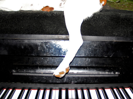I have been creating music more and more with my eyes shut. It helps me to think only about the music because the scenery around me has been the same for awhile so... nah, I'm not sure why it has been becoming easier to play with my eyes closed but... funny thing, while trying to bring back the memory of old piano pieces I used to perform I look at the piano keys once in a while. Mo has developed a way of laying on the piano with one leg hanging over, right in the middle. With the piano keys being black and white and his paw being white with the piano black... I get dizzy and confused. Now thats... crazy! I'm not kidding about that or making it up.