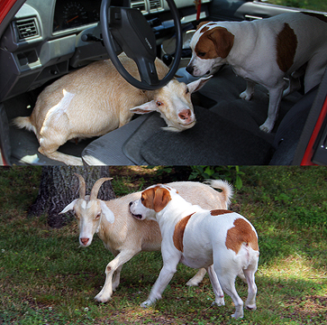 and ugly. After that bit of philosophical thinking Mo and I went to my friends house. Her goat came over and got into the truck with Mo. Then Mo began to treat the goat like another dog wanting to play and dominate, etc... I got Mo onto the piano and wanted to get the goat up onto the piano seat. Since Mo was ontop first the goat wanting to get up but wasn't going to take any chances. I should have had the goat get in first! It would have made for a great picture, eh?