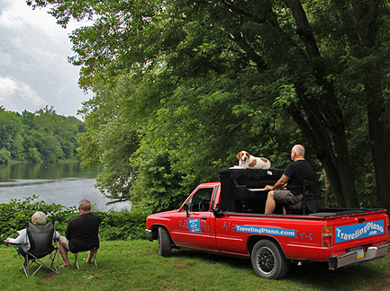 The original plan for today was to go and park the truck on a street, practice performing for the parade I will be in on the 4th of July. Its been a year since I performed and I need to get used to distractions around me. When I create music in the woods... no distraction. I had no idea it was going to be ninety five degrees out and there was no shade so we drove to Maryland by the river to play under a bunch of trees. My friend Jeff found us with his daughter and we had some fun along with a few other people. There was a seventy year old couple relaxing on lawn chairs where I wanted to park the truck. I asked if they would mind my parking next to them and they said certainly not. I was sensitive to the situation because I thought the music might be too loud. They said they were old and can't hear so not to worry. Real down home folks, once again I was amazed as I listened to the guy describe his experience of my music in nature. It was with sweet details about the clouds and trees, the water and breeze and how it all fit together perfectly and made everything better than ever. He said it was like watching an artist create a painting. His wife kept nodding and verifying that was what he was saying to her as I was playing.
