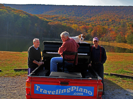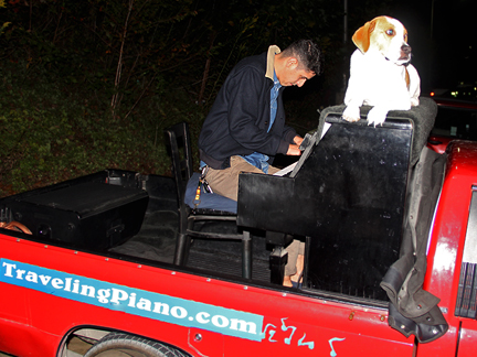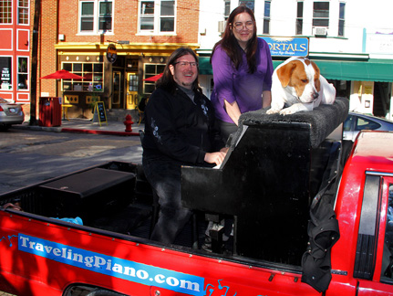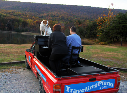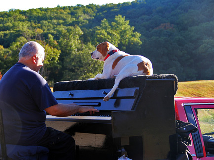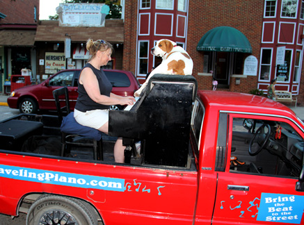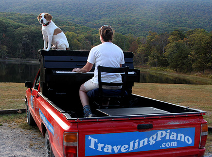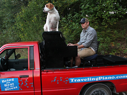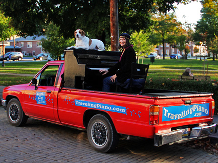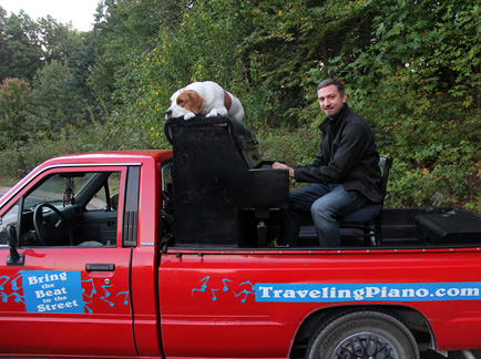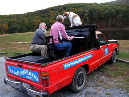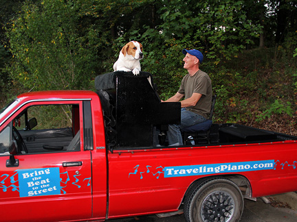 After having shut down emotionally for all of yesterday, when I woke up this morning, first thing... I began to work with my tool of gratitude to get going... "thank you for the bed, the place to stay my dog, my body to get me around, having enough food, the ability to create music, enough money, etc..." that helped. Then I knew I would have to go out with the Traveling Piano truck and interact with people. Thats what I do to keep going. Having said it many, many times, my job is to reach out and connect. Then everything else will fall into place. I drove to the center of Berkeley Springs for a few hours with the Traveling Piano truck. When I feel needy, what I need to do is give. First thing that happened, a young girl I know from town gave me five dollars she had been saving for weeks to give to me because she knows how important it is at this time for my friends to contribute. Then she got me some muffins and a drink from the coffee shop to add to that, just to be nice. I know she has very little money. That fact that she extended herself to me... remembered to... was very significant for me. I thought, "validation for my decision to connect with people today." Then an unusual amount of people gave me small contributions without my asking... not even wanting. On the way out of town, I stopped at the supermarket to get some food and the bill came to almost exactly the amount people had given to me. I thought, "assurance." When I got back to where I am staying a friend from England sent me a hundred bucks, enough money that now I feel secure enough to go out and get a new truck engine. His contribution put me over the top so to speak, to empower me to move on. Its all about my doing the right things and then the right things happen.