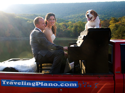 It did stay on my mind all night and while driving back into the park today to create music... constant right relating about the encounter was front and center. Letting it be what it was, being conscious to not create illusional possibility about it, letting it go with all the other synchronistic experiences I have had. It was about four in the afternoon. As I entered the park there were a lot of cars driving around. I knew it was people from the wedding and assumed they were all on their way to the lodge for the reception as the wedding probably happened in the late morning. I headed for my spot on the lake where few people ever find. It was strange, for the first time ever there was a large pile of dog poo on the grassy area in front of where I play. Since 2006, coming to the park I never saw something like that and felt like I just had to clean it up. Weird, because I don't pick up after my own dog, why was I searching for something to help clean the area so I could play music? Well, I did it and then jumped onto the piano to play. Before I even got started a couple with their baby boy stopped by and I began to tell them about the strange encounter with the groom the night before. Out of no where the groom arrives with his new wife and two photographers, no one else. That was mind boggling. How synchronistic that we would meet again at such a specific time. They had come to get a few quick pictures by the lake and then get back to the wedding. I asked if he wanted to get onto the Traveling Piano for a few pictures. Ha, I ended up driving the truck onto the grassy area I had just cleaned up. The bride and groom got onto the truck, played some notes, did some smooching, we got some pictures and they were gone. He gave me a hug, kept saying I was a good man and he would find me. Now for me... its back to staying away from the idea of potential. If I look to what happened and project it as the solution, depend on it, hang onto it, not let go of it, try to work it in anyway... I know from experience zero will come from it. The experience was totally interesting, coincidental, serendipitous in a sense of fun and nothing else. Something could manifest from it but my job is to stay out of the way (in my mind) and if it is possible that this guy might be able to help... I must trust calmly that it will happen, let it happen in its own way, in its own time if it is meant to be. Situations like this often simply show me that possibilities exist, not necessarily that they are the possibilities in of themselves.