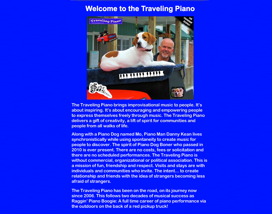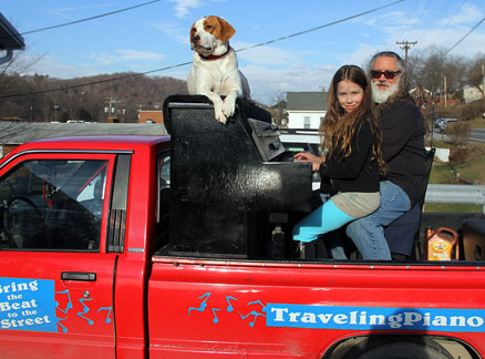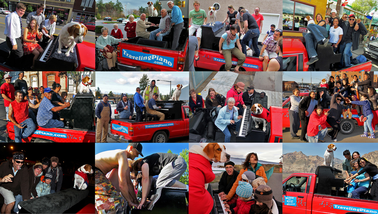 If you have not kept in touch with the Traveling Piano you may be surprised to find the Flight of Peregrinating Musical Exploration journey... is alive and strong. It has been eight years now. The mission: Fun, Friendship and Respect with Musical, Empowerment and Inspiration at no cost and without Commercial, Organizational or Political affiliation... Music for People to Discover. The Traveling Piano is my full time work. Most people do not know this but I do not get paid a cent for my work. I am not independently wealthy and use no welfare system. No tips or funds are solicited from the Traveling Piano truck. All costs incurred since the beginning of the journey in 2006 have been paid for with the remains from the sale of my home. Also, I live in providence with trust and faith. The people I meet often share basic necessities. I do not project neediness into my work. What has made the Traveling Piano unique is its unconditional nature of giving without the need for attention, validation or any exchange of money.
