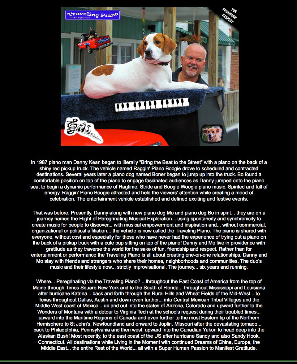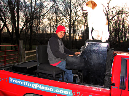 There are many routes for me to take in raising money but there is always business involved in some way. Seeing as the Traveling Piano is about personal relating, I prefer to ask for contribution personally. A one time gift or... please consider becoming a sustainer for the Traveling Piano. A monthly recurring gift of 3, 11, 20, a hundred dollars or whatever you can give would not only help keep the Traveling Piano going, it would encourage me tremendously. I have found that many people have little experience in giving simply for the sake of "giving" in of itself. Giving makes life work better. Try it on behalf of the Traveling Piano. Pure and honest random acts of personal kindness in the world without commercial agenda... we all need as much of that as possible. How amazing it has been for me to enter into situations such as the devastation of hurricane Katrina, onto the campus memorial area after the student massacre in Virginia Tech, into the tornado areas that destroyed a large part of Joplin Missouri, the hurricane Sandy affected areas of New York or on the local playground in Sandy Hook Connecticut after the school shootings there... and be able to lift spirit. No one knows we are present except for those who find us. The Traveling Piano is personal. It has been awesome to be able to create relief for others in moments of despair and to have a fun while creating relief appropriately through spirit, a dog named Mo and a piano in the back of a pickup truck in the most difficult of life situations.