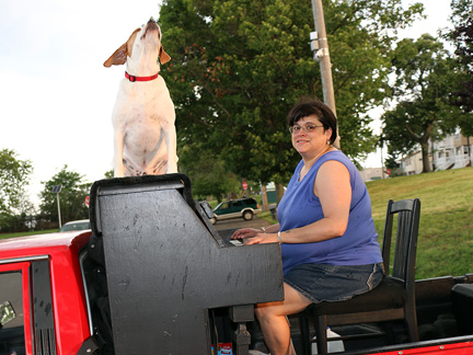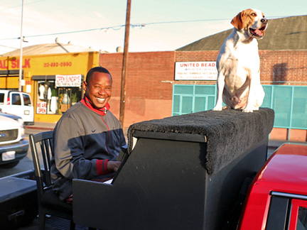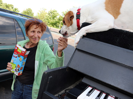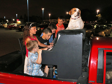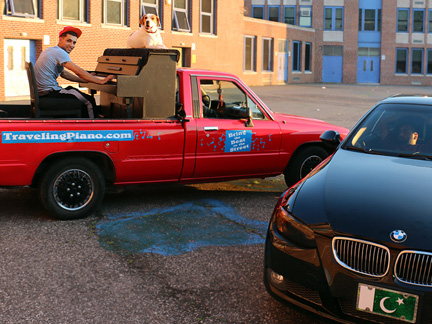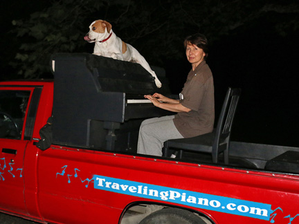 Mo waited for me in the cab last night while I went to the movies in the old neighborhood where I owned a house many years ago... I found a message on my answering today from the police about that. It was raining and about 68 degrees, with the back window open for air, the cab is a den for Mo and he was fine. A random dog fanatic called the police to complain. The police called me on my answering machine to say I'm not allowed to leave my dog in the cab. Stuff like that, one idiot can so easily create trouble. I would like to create a law requiring muzzles for over the top dog fanatics always looking for trouble. They have no clue of their self-centered concerns. And the police... I am so glad I did not answer the phone or have contact with them. Why are they required to pass on the ridiculous complaints of others. I would have told them that I can in fact leave my dog in my truck! People can be so out of control with authority, fearful assumptions and sticking their faces into situations they know absolutely nothing about! They cause problems where none exist. Truth be told, I was raised with super fear of authority figures so that cell message really affected me in a negative way. Especially now at this point in my life. It seems I am losing my patience with injustice and stupid people. Fear underlies a lot of anger! Thank god I have a way to express my emotions... fears and joy etc... I do it through writing, pictures and music and all negativity gets healed through the people I meet with the Traveling Piano.