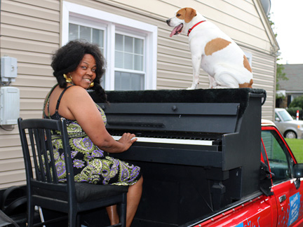 What has happened in Charleston, South Carolina hits me to the core, the mass murder (with a gun of course) of nine people over pure racial hate. I've been intimately involved with two mass shootings and two unjustified high profile racial murders through the Traveling Piano's journey. Part of me wants to take the Traveling Piano to Charleston as I have done with other tragedies to show appreciation for the forgiveness family members and community have been putting out to the media and also to show support for love over hate but, I'm not going to do it as there is too much anger in my heart and it would interfere with empathy and compassion, my love. I do not want for my Fun, Friendship and Respect to be motivated by anger. There are also other reasons. I am still dealing with "stuff" here in Philadelphia. Karen, one of the health aids for Pat and Marie, two of the ladies we are staying with... she jumped onto the Traveling Piano seat in the driveway for a few moments.