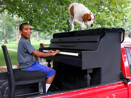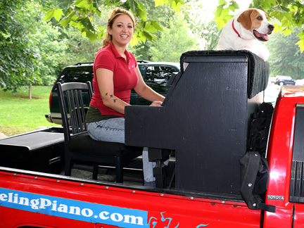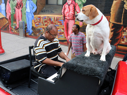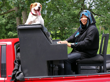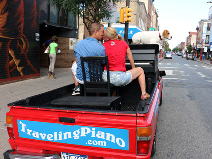 It was hot, humid today. We stopped anyway on Broad Street in Center City Philadelphia with the Traveling Piano and almost immediately a guy wanted to jump in to play. Then complete strangers walking down the street began to gather and sing. We were outside a huge church ministry and everyone was eating lunch outside because it was too hot inside. It was a lot of fun but I had to watch not to over do it with my energy. The sun was burning my head and I was with my friends Stephen and Shehara who wanted to get something to eat. We stopped in the local market and a woman who found the Traveling Piano in Fairmount Park about eight years ago was there playing piano for lunchtime. She found us again about four years ago and I had driven her around the city while she played. She must be about ninety years old by now! It was weird because I paid for parking, we went in to eat, found her today and then left without eating... sort of like we were just supposed to connect for a moment. When we did finally eat it began to pour rain and I could not keep the truck windows totally closed because of Mo. The cab is going to be damp and smelly for a few days. It felt good to get out and about with music today! There has been a lot less lately. Last night I played in a park in the dark for a spell. It feels like I don't know what to do everyday. In my mind I'm getting ready to leave and it taking all of me psychically to do it.