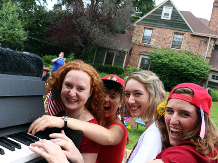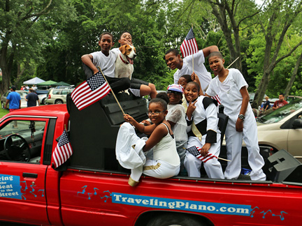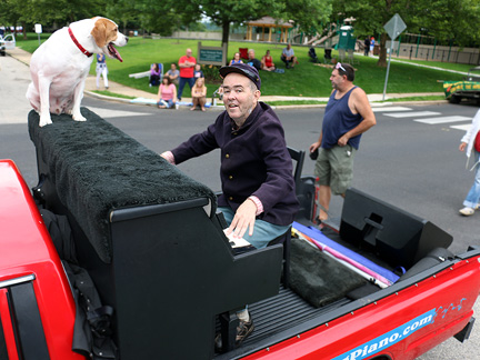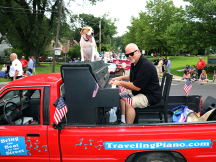 The neighbors all came outside and the crowds gathered for a parade to celebrate a Happy 4th of July in Oreland, Pennsylvania. I think it may have been my 20th year with the community. One year was missed and that was when the Traveling Piano was in Alaska. This was the last year for me. My friend Sid who volunteers with the local Lions club has run the parade for all the years and this was his last also. My practicing over the last few weeks paid off. The musical notes were strong in my fingers, I was a little short of breath but felt in control the entire time. In fact, my performing was musical and not all just manic energy. Parades are a high energy endeavor. I worked them as part of my musical career for twenty years pre the Traveling Piano journey and all on the same truck. It was cloudy and that helped a lot. The sun would have made it difficult energy wise. I had everything ready to go when I woke up... gatorade in a cooler, food, sweat rag, umbrella, posters to give away, camera, directions, etc... you would think that after twenty years I would not need directions.