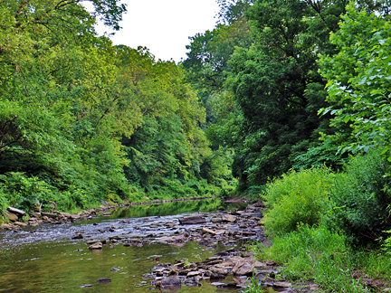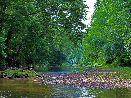 Have your ever walked up the center of a creek? While walking alongside Pennypack Creek in Northeast Philadelphia taking pictures last week I wondered what the views would be like from inside the water. It is warm now and the water about three feet high at the deepest point so it became an agenda to be fulfilled today. It was fun and once Mo got the idea he had fun too. He swam from side to side, found rocks to walk on, some areas were just sand. With my sandals on I had to be very careful to not lose my footing. At one point where the water was rippling I began to get dizzy. Wow, it is an age thing and I thought, "you need to do everything you can while you still can, like walking and moving around in water on unstable creek beds. It did not last too long, about a half mile. Maybe I'll do it again on another day. It was fun and the water was clean, just a little too much city trash, plastic stuck in the tree twigs and on a few rocks. Afterwards, Mo and I rested in a grassy area and then I felt drawn to the corner of a parking lot area to create some music in the trees. There where a group of young kids hanging out and they came over. It always gives me a good feeling to see groups of friends hanging together. After they left another young group of bikers stopped. A few families stopped. There was not much time for me to play music because there was a steady stream of people.
