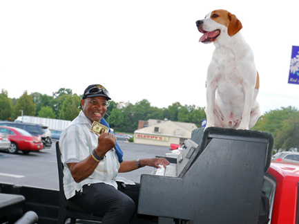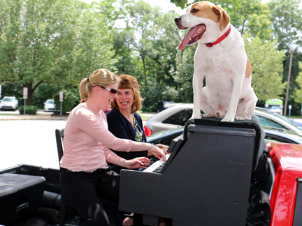 We started out in Wyncote, Pennsylvania today having lunch with my friend Sid. We went to his work place and of course everyone in his office had to have a visit from Mo. Two of Sid's secretaries who I have talked with via the phone for years came outside to have a moment on the Traveling Piano. Across the street from where we had lunch there was a pet grooming store with a pup in the window. The dog was marked with Mo like colors and spots so Sid and I went over for a look. It was up for adoption, rescued from Puerto Rico. I let Mo in to play with the pup a little and he was like, "let me outta here!" I was thinking, "the money, time and effort spent in saving this one little dog has more value for dog rescuers then babies in need living in squalor down the street!" Then it was onward to the corner of Olney and Broad street in the northern area of Philadelphia. It is a major bus transit area that I have never played in but have always wanted to. As usual, cars were parked all along the street even though it is a no parking zone.
