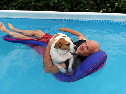 Got the truck back from the shop, he didn't put a carburetor in. He simply tweaked the timing and adjusted the flow of fuel. It all feels very strange but... the truck is working ok as I write this. The guy told me to take it out for a test spin and then left the shop to get his hair cut without telling me. Very... strange. Anyway, the situation saved me five hundred bucks! It cost total eighty five cash. With the heat today, I went into my friend Cindy's pool. Is it possible to sweat in water? The water temperature was in the high nineties. I wanted to see if I could float with Mo in my lap and wanted for Cindy to get a picture. The lap idea and floating did not last long but out of about a hundred and twenty quick pictures, I got three great ones. I stayed up until almost seven looking at online fundraising sites. Something must happen soon. The financial situation to keep going, a home base to use (I have none) with my age and almost finishing ten years of journey now... I wonder if I am wanting to beat my head against the wall again with trying to fundraise again. It has never been a success in the past and my passion to do it is not strong. That is why I sold my home to keep going, to help pay the way all these years and thank God for people who have invited us into their homes!
