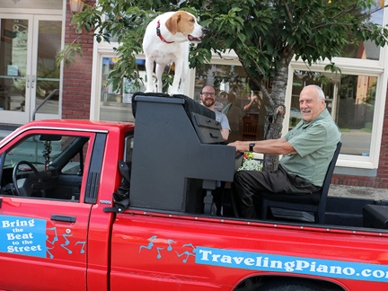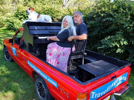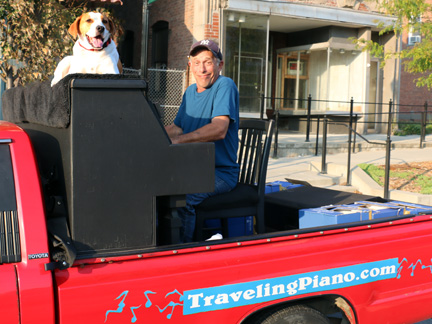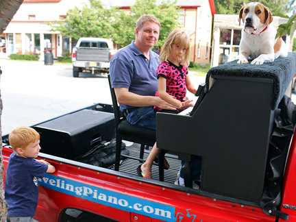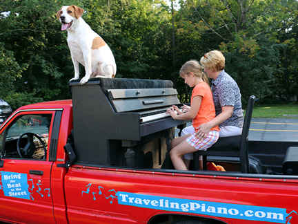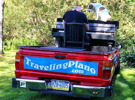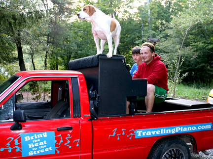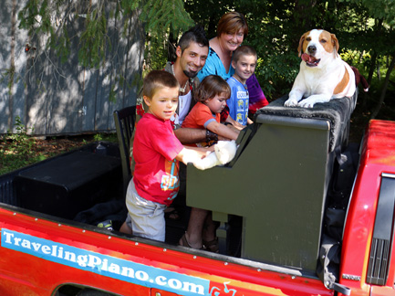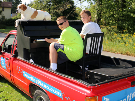 The food, plentiful like always. I cannot ever remember staying with people who have so much food ready to eat all the time, never feeling like I have to watch how much I take of whatever, or using anything up. I parked the Traveling Piano down a slop in the back yard and a few family members came down to play. Once I could maneuver the truck into some shade I created music for myself. Anurag, John's friend who we picked up from the train station yesterday just came back from traveling through Asia for two months. He is a New York City public school teacher and starts work on Tuesday. He has not even been to his apartment yet to settle in and invited me to stay with him while I am in the city rather than pay for a motel which I had planned to do this week. Then he made his offer worse. He said Mo would be more than welcome as his apartment building allows pets and... parking on his street with the Traveling Piano would be very safe. That... made be crazy because I'm trying to give myself time in New York City totally away from the journey just for myself alone. I've been trying to do this for ten years! But, to have a place to stay in New York City city to have Traveling Piano fun with Mo? Thats just crazy tempting. Ugh! Such a dilemma to have?