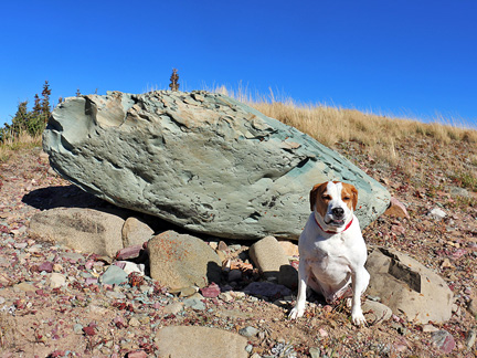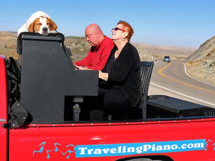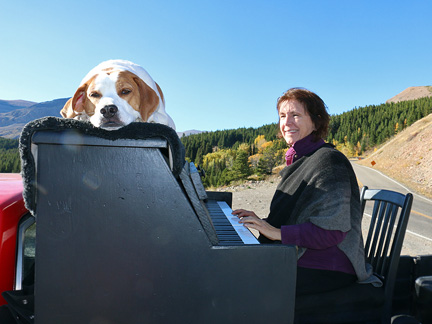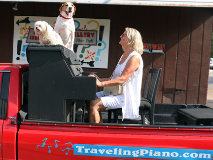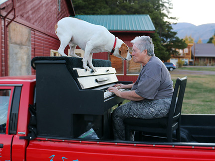 It is almost unbelievable that I was able to visit Piano Dog Boner's burial spot today... a most beautiful place in Glacier, Montana high up on a hill known by only a very few. Never in a million years did I expect to be back here again. In 2010 I buried his ashes in a special box with his personal belongings and a picture card under a large boulder. Someone has been to the site. I found a variety of coins laying under the boulder on top of his stones. That totally broke me up. I cried not only for my love of Bo but to know that people care about me, my dogs, the Traveling Piano and what I do. Thank you to everyone who has ever expressed appreciation for my world. Every person has a need to know they are valued and loved. There was a tight barb wired fence about 500 feet from Bo's burial spot. While walking along the fence line into the woods to find a loose spot I realized it might become difficult to get through but I was determined and sent a prayer up to Saint Anthony. Instantly the fence ended and I simply walked around it to the other side. On the way out we pulled off the road for some scenery and to create some music. There was a woman there almost like she was waiting for us. She in fact had met me and it took a while to figure out that it was here, last time. Wow! After that it continued as always and I was hearing some good stuff.
