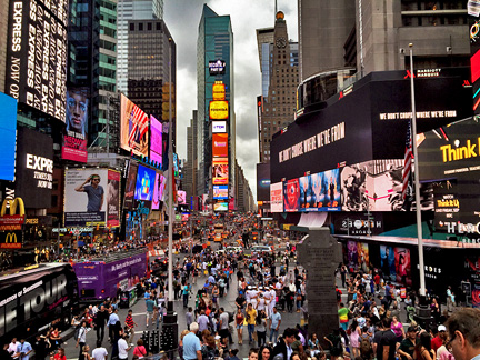 I woke up and ran straight to the half price broadway show ticket both. I took the subway. In the old days I was too proud to use the subway and preferred driving my vehicle around New York City. Then public parking disappeared, then paid parking became cost prohibitive, then the crush of traffic made driving a waste of time and now... I would never have the clarity for the quick driving reactions needed in today's life... so surprise, the subway was not so bad! Ha, really is was actually easy to use and quick and with an all access bus/train pass, thirty one bucks for a week. I was on an elevated train for the first time in forty years. Walking around without my camera or Mo on a leash... with nothing in my hands felt really... light. It is a good thing I have a camera phone. Taking a few pictures while in New York City is a must or I will never remember anything that happened from day to day. First I saw a play... The Curious Incident of the Dog in the Night Time. I'm in heaven, it was wonderful. Times square is amazing but nothing like the old days when it was commercial, sleazy and creative. Now it is totally commercial, one big ridiculous commercial so ridiculous that it is interesting. The fact that capitalism can be so big and ridiculous and that most people in the world suck it up like it is everything and there is no tomorrow is interesting. It is also sad because the reality is that many people left out in the cold directly as a result of it.