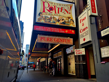 Today was a two broadway show day! I saw Hand to God which was a fun show that had puppetry in it and at night I saw Something Rotten. As far as I am concerned... if you want to be entertained by a Broadway Musical Comedy it cannot get any better. It was everything I love about a broadway show and now in writing this blog after I've left New York, Something Rotten was my favorite experience. Purchasing tickets for any type of entertainment is now a total racket. They farm out tickets to all kinds business and individuals on the streets, have lotteries to get tickets, you can get them direct from the theatre and prices go from $20 to almost $500 for the same seat. Most seats for almost every show are sold on the day of performance. Time Square at night with all the people walking around was phenomenal. It was full of what looked like tens of thousands of bobble heads, so many people in such close space. It is impossible to feel prejudice against any one kind of people in an environment such as this. There was no one type of person that stood out. There was every age, shape, size, color, language being spoke and every type of attire. The weather was beautiful all day. Getting up in the morning was a challenge. Anarug had left and I almost just wanted to just stay in and lay on the futon all day. Physically, I was exhausted from all the running around the last few days. My friend Mark a few months ago came to mind as an eighty something year old guy still working full time at his job.