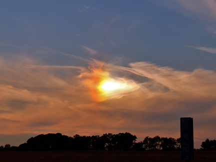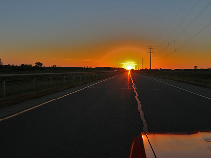 The temperature today went from ninety one degrees during the day to forty eight during the night. On the way out of Madison Wisconsin I stopped and purchased Two Egg Mc Muffins for the first time in years. They came to $3.50 a piece for pure processed fake bread, egg, ham and cheese and tasted like nothing satisfying, lol. The experience will satiate any craving for a Mc Donald's impulse again for hopefully a long time to come. Earlier this year I saw my first Sun Dogs in the sky. It was to the right of the sun and then I saw another ten minutes later to the left. It happened again today while driving through Wisconsin into North Dakota. Do you know that what you are seeing is not the sun? The sun is not in the picture. Look it up online, its very interesting. They are reflections from the sun from both sides, a phenomena. When we reached my friend Joe's place in North Dakota we met his three dogs, Peter, Petro and Sparky. Dogs are so much a reflection of their owners, these guys were all super loving and extended themselves in friendship as clear as could be. Joe was worried about them getting along with Mo especially concerning Sparky who is old and grumpy but as soon as they all established turf, everything was ok. They are farm dogs and I grossed out in seeing Peter chew on a mouse for fun and how they eat each others shit, even their own and of any animals that they can find! Not my dog please!