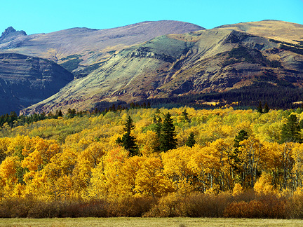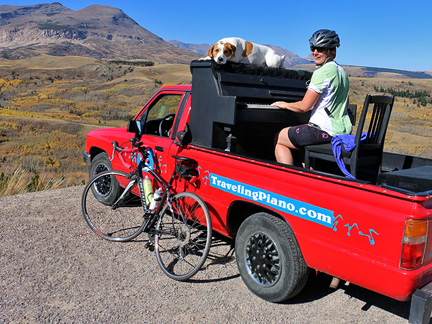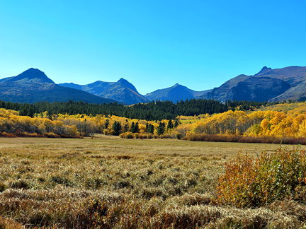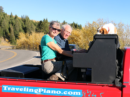 With the days numbered before winter sets in I wanted to drive through Glacier Park. Its still open which is unusual. By the time I reached the second overlook I had to stop and create some music. Then I thought, why not just spend the day here. I did not expect many people to drive by but there was a steady flow. On the way, there were some guys doing road maintenance and I wanted to stop for them but did not have the umph. They ended up stopping where I was playing. We had our Traveling Piano fun. A couple from Michigan wanted to make a contribution and they gave me a hundred bucks. I really appreciated that and need finances as in I am now dependent with practically no reserve of my own. I met a phtographer from California and the spot was perfect for pictures. The truck was parked one foot from a cliff and below it looked like a field of yellow mums but they were all tall aspens. Right before the sun set I drove to a spot I knew where I hiked years ago. Mo and I climbed a huge, steep hill until we were literally on top of the world. Where the energy came from to do that... well, I just wanted to do it so I did. To walk where very possibly no other human being has walked, very off the beaten path... in total wide open nature... there is nothing that can compare to the feeling.