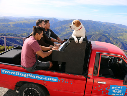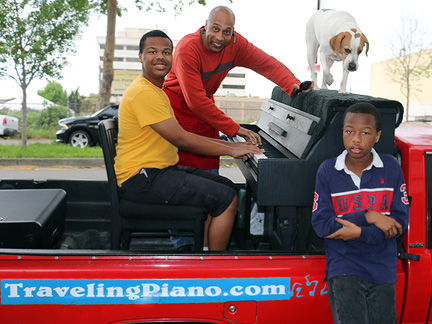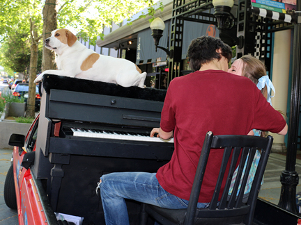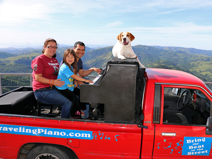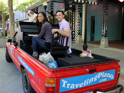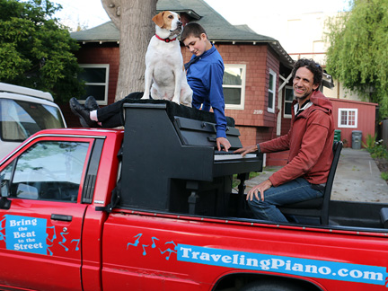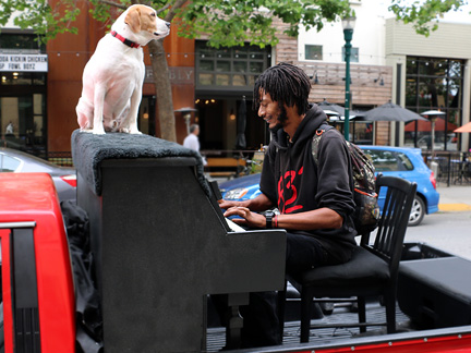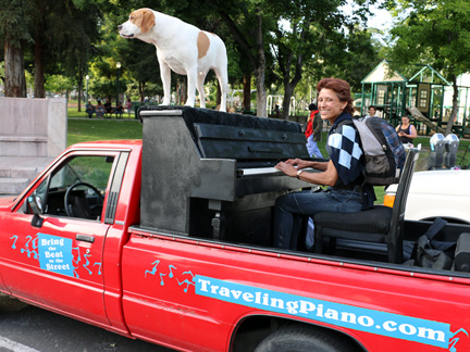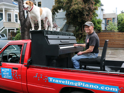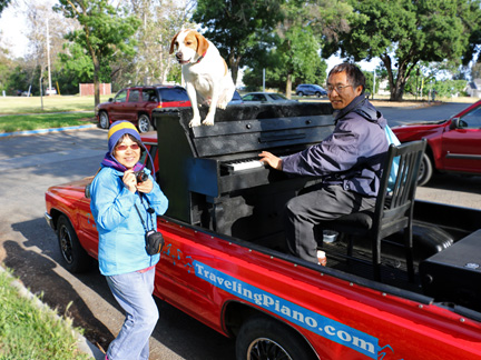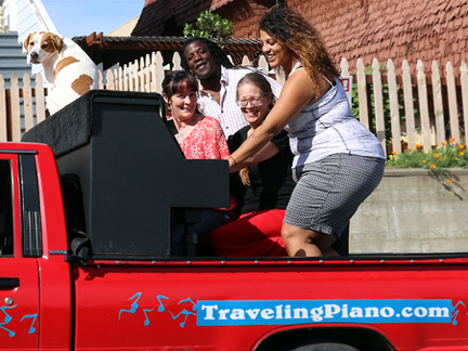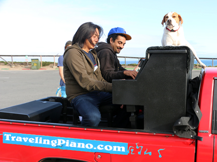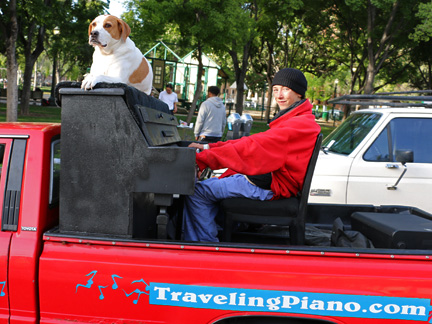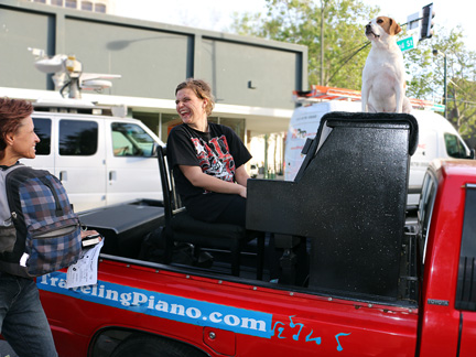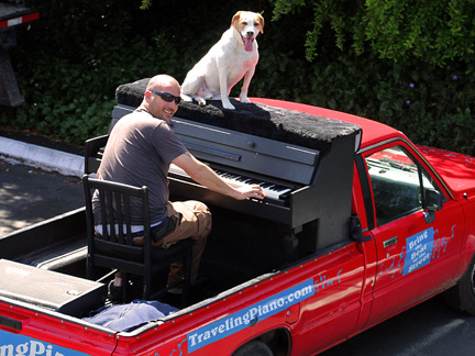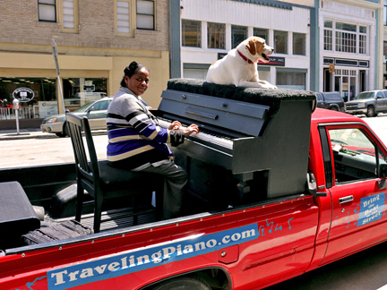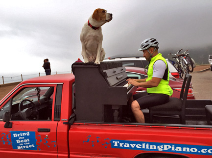 My favorite thing happened. Strangers got together on the truck to create music together. I met a guy with his electric motorcycle. His dog rides with him in front. I secretly wondered how much he gets hassled from over protective dog fanatics these days. A young guy recovering from cancer and having a really bad day arrived with his mother who is a successful author. We met another guy in recovery. On and on... It feels so good to be able to give people attention, understand, empower, give people a lift for their day, create a distraction for people from distress, inspire, share personal validation, have people trust me enough to open up about personal issues and do you know why? When I am able to give that to others, that is what I get back from them for myself and I can't get enough of all that! Its selfish, in a good way. Several people cried from relief, wonder, love and happiness because of the Traveling Piano today. "I was having such a bad day..." there is no other comment I hear more. That would not happen if it was a group situation, it is the personal one-on-one relating... it happens through that.