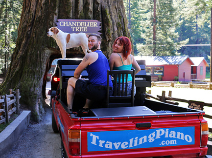 The "big man" could do nothing but give me attitude when I asked him to take a picture for me and a guy at the mechanic shop next door was going to, but literally ran away when he saw the sticker on my bumper reading Gun Free Zone. He wasn't down with that. Lol... I'm down with human dignity now, for all! Then I found a covered bridge that was closed. I've always enjoyed covered bridges, there are many back where I came from in Pennsylvania. There were a bunch of kids hanging out there. They all sort of scattered away after I musically connected with one specific kid and his dog. Onward, I drove into Boulder Creek which had a good energy for me so I stopped and played music on the street there for a spell. We met a dad with his daughter and a few other people. The day moved smoothly with a lot more Traveling Piano work than anticipated. While meandering up mountains and around curves I found a vista point and as soon as I parked two women approached us with their dogs. People would pull into the area and were like magnets. With no hesitation they would come over and wanted to interact, get on the truck and play music for the first time... etc.