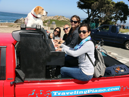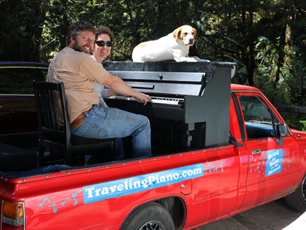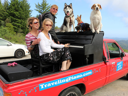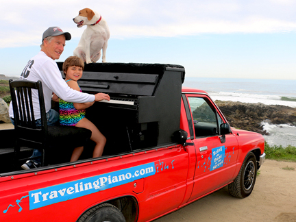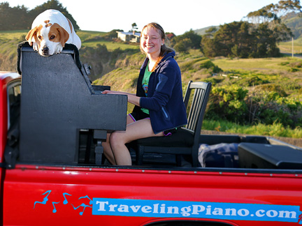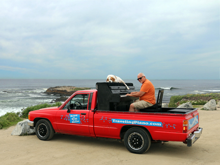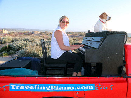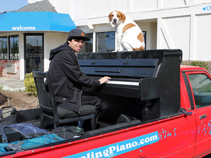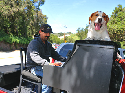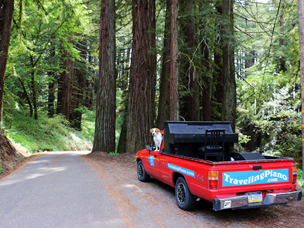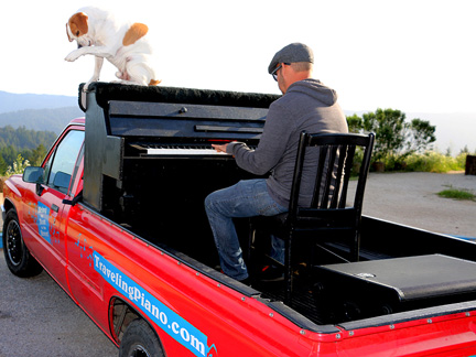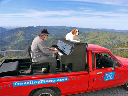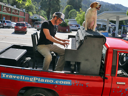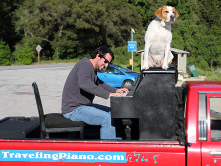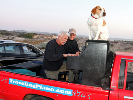 The coast here is as awesome as in Oregon but not as up close and accessible. I know everyone has heard of rural countryside but do you know in the United States there is rural coast? It is amazingly raw and unrestricted. You can drive your vehicle up to a foot from the end of a cliff that drops off straight down and I mean sharp, straight down! For the first time I would not let Mo out of the truck to explore at all. There was nothing to warn him of the edge. I kept thinking, "Am I in the United States? It felt like rural Ireland or Newfoundland. We drove through small places like Rockport, Westport, Kibesillah and Inglenook. On a random beach cliff, a seventeen year old female jazz pianist from Washington State with here parents found us. She was on her way to perform with her school band in the Monterey Jazz Festival. Now you know how much fun that was for them to find a piano on the back of a pickup truck with the cutest dog ever hanging out on top in the middle of nowhere at sunset, on a cliff overlooking the ocean in a spot as beautiful as it can get! The day became totally fulfilling for me because as I started out driving, I gave myself a reality check for today... and not for the future. I have some cash in my pocket, the Traveling Piano truck running and everything that goes with it, my best buddy Mo with me, opportunity, time, nature at its best, no obligations, expectations, there are as many people to share life with as I could possibly want, my spirit is alive to enjoy life and today was the most beautiful of days for a long and winding road drive of nothing but magnificence.