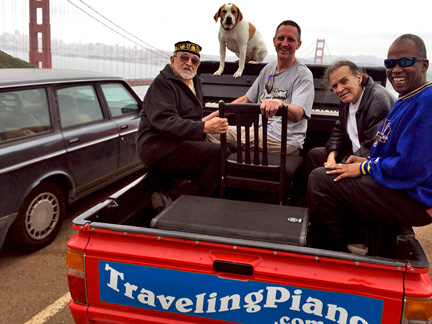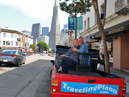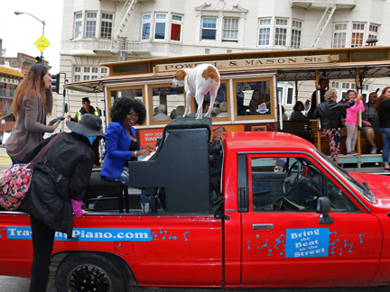 It was a difficult start, living from moment to moment is not easy. I'm very grateful that I got in one full day in San Francisco with the Traveling Piano. Some of the day was even sunny! I the past I've used local parks to find my way to places. Lately I've been using addresses of restaurants people suggest to get me into neighborhoods. The address I started out with today took me to Alameda an island away from San Francisco. I was hoping it would be a different way then in using the Bay Bridge which has been packed with traffic every time I've crossed it. Nope, had to backtrack and surprisingly the traffic was not too bad. I was driving around aimlessly and started to find some of the very steep hills and getting caught on them at red lights, my old truck and a stick shift to boot... not easy, not easy at all although going down the streets was kind of fun and very scenic. The first place we stopped was on Powell and Mason Streets where cable cars were running. That was a lucky find.