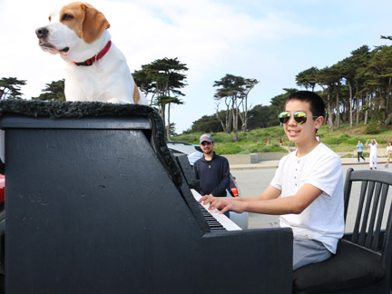 Then in Chinatown a guy told me to check out the Good Mong Kok for decently priced authentic Chinese food. There is always a line outside so two ladies made a purchase for me while I played on the piano. Dim sum... shrimp, beef and pork dumplings and a BBQ pork bun... wow, thank god for good dim sum, lol. They gave me three dollars back from a ten and there is no way all that cost seven bucks! Afterwards we ended up in Washington Square. The Transamerica Pyramid building view drew me there. Lastly, I drove through Golden Gate Park to find waterfalls and Buffalo? At the end of the road we were ocean side and spent time at Lands End Lookout. I did not expect to find such natural beauty in this city or an ocean beach. Before setting in for the night I took Alex my host and his son Canaan out for pizza and I drove them to the place while they played piano on the back of the truck. Mo hung out on the piano as we drove through the streets for half the time. Alex's wife Carol and another son Taebin were out doing something else and Ravi the dog I have been watching for the last few days stayed back at the house.