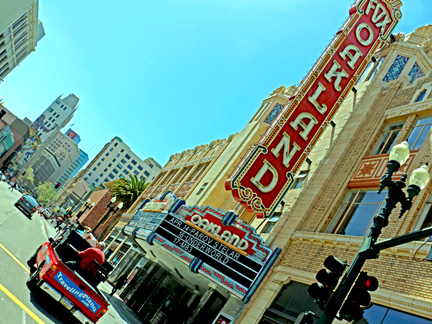 Luckily, I am not too far away from Berkeley CA where I left yesterday because... this morning I got a text message saying I left to bags back there. Damm, I had left them outside on the side of the house in the alley I am so lucky no one took them, its a prime neighborhood for that. As I have said, I've been fumbling with little clarity these days. The traffic on the way was fine but I could see on the other side of the highway that coming back was going to be hell so I took the highway option off my GPS and resigned myself to a slow easy drive through many neighborhoods. If you really want to see the underbelly of a city or town, this is the way to do it. A GPS will tke you in and out of every little street. In the motel room where I am staying there is a picture on the wall of the Fox Theatre in Oakland, a very cool design and I thought it would be great to get my picture with it but had no energy to put out in order to pursue the thought. Well, I'm driving into Oakland and right in front of me, there it was! I was thinking just take a minute and get a picture shot. That happened and then a bunch of kids started screaming and applauding out of an upstairs window. Housed in the building was a performing arts school. Ha, you know what happened next if you have read this blog over the last ten years. Afterwards, I drove into a wasteland of trashed neighborhoods where I was going to create music but just felt too tired and gave up on the idea. I needed the rest of the day to chill and that is what I have been doing... chilling with work that I can do from my hotel room.