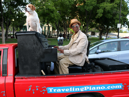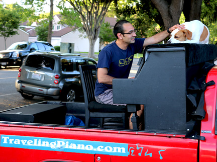 Onward... again. Life is always working out but very on the edge. I've been living hand to mouth, place to place and need to settle somewhere. More support is needed to do that. I got a room in Oakland at a motel for two nights and I told the receptionist on signing in I'd jump onto the truck for a minute for some music before parking it. Lol, people are so funny, they came running outside with their camera phones in front of there faces about seven in all... they were all experiencing the Traveling Piano through their phones while being directly present and in front of Mo and I. Later, Mo and I drove out to a random spot by some water. Psychologically, I needed to create music for therapeutic reasons for myself, to heal my fear, reassure my faith, validate my gratitude and appreciate the present moment. There where a couple homeless people were hanging out in their cars. No camera phones for them as they were more interested in just being with me in the moment. There was a woman in a car not too far away. I couldn't see here because the vehicle was filled with stuff but I could feel her listening. When I was finished she began to pull away and stopped to say thank you. She said that I was an angel in her life today. Another guy parked behind me and to the side came over to say he "felt me" and it was spiritual, that he was singing with me and I didn't even know it. He thanked me for taking the time to create music and do what I do.