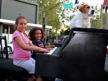 Feeling a little more together I asked a woman if she new where Mountain View was as that is another town I was told about. She said, your in it! I drove to the main street and it had a really good vibe. I told myself to play some music just for a few minutes so I can say I did it and then... my life began. First thing, a guy from Portugal came over and began to jam with me. It was so easy to do with him, he was very giving, perfect. To feel completely natural creating music with another person is super rare, just creating improvisation in of itself with another person is a rare happening for me. Then others began to approach us. A seventeen year old couple on a date, the guy wanted to play and he was an exceptional classical pianist. His girl friend was totally enamored with his music like I have never seen. He was able to acclimated himself with difficult pieces of repertoire from an acoustic piano to my keyboard like a professional. I asked him what was his favorite piece of music to play and he told me it is always the newest piece of music he is learning so, he's never good at what he enjoys most. Good reply! I met another couple on their first date and I might have been a buffer for the situation. I really enjoyed them as they were peers, smart professionals and it felt really good to be around educated people who appreciate life on many levels. This town I was told is totally Google oriented people while Palo Alto is mostly Apple and that made sense to me. As I drove through some of the neighborhoods the houses were small but all so nice. Then I learned why... they cost over two million bucks each! Absolutely crazy... back in Santa Clara I found Jeremy and a friend he works with named Oliver. They jumped onto the Traveling Piano with Fela Jeremy's pup and of course a picture followed. It turned out to be a very fulfilling day and as far as all the uncertainty that surrounds it... it is what it is.