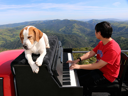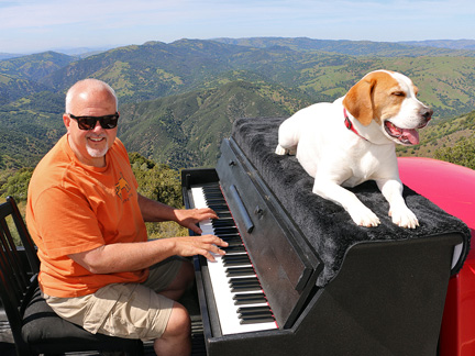 I took it easy again today as I am feeling very tired. It might be from not sleeping good as a result of weight gain again? That rears its ugly head. I've been eating a lot of candy and bread. Maybe I will become a vegetarian ha, what does that have to do with candy or bread, right? My host Jeremy took a bicycle ride today. He rode one... hundred... miles in like seven hours!!! Fela his dog stayed with me and Mo and we went for a walk and also they both sat on top of the piano while I created music in a parking lot along a running path. Amazingly, no one paid enough attention or even reacted. (in front of me at least) At night the police came knocking at the door... outside, some kids where breaking into a car and that car on the street... next to the Traveling Piano in the driveway! I'm glad they did not know that my nine hundred dollar speaker was under the tarp. I am posting a video on my creating music on top of Mount Hamilton the other day.