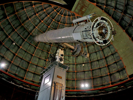 There have been three times on this journey where I have found myself in such a ridiculously precarious situation while driving that I had to laugh myself through it out loud. Today was one of them. At one point my heater meter for the engine almost went into the red. To have the engine overheat on that hill with no place to pull over would have been very interesting indeed! At the top I felt dizzy and light headed. I'm sure it was from the constant circular turns more than the height and altitude. I looked it up online... 365 hairpin turns! The view from the top was as expansive as I have ever seen. The only view Mo and I have ever seen like this was when we crossed into Alaska via the Top of the World Highway from Dawson, Yukon Canada. It was awesome!!! This observatory is the world's first permanently occupied mountain-top observatory and was built between 1876 and 1887. The staff came out to greet us and thought it very interesting that a piano man had pulled up in his truck with his piano as the observatories builder James Lick was a piano maker. And then they learned that I came from Pennsylvania and that happens to be where James Lick came from! He is now buried on the grounds. They took me inside to give me a special look at the telescope.