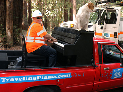 In somewhat of a fog I took a drive with the sole purpose of enjoying the nature of the day for myself. With the intent of my journeys mission planted firmly, no worries about becoming lost in myself. I found a redwood forrest off to the side of a road and drove into it a bit and stopped next to a humungous tree to create music. After about ten minutes a huge truck appeared from around the other side of the tree to dump dirt in front of where I was. It was a small area but the guy knew what he was doing and maneuvered it around the tree and me easily. He had seen us pass him on the road back a ways. It was funny, strange and fun. He jumped onto the piano to play a piece of music he learned when he was young. Then we as we were driving through Felton we passed a prison crew cleaning the fire department grounds. No one was parked by the curb and it was legal so I pulled up and shared some Fun, Friendship and Respect with the guys which they super appreciated.