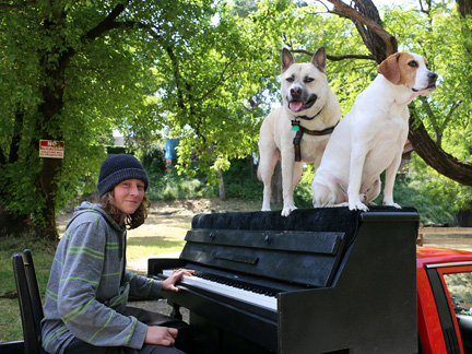 It was raining when I woke up and I thought, "good." It hasn't rained in a while and I need to shut down and get some non-outside with the Traveling Piano work done. Then the sun came out and I said, "no" your not going to go out today. So other than a walk with Mo and Fela... wow, those two get along so well, they really like each other and play some everyday... I shaved my head, cleaned up some around the place for my friend Jeremy, cooked food (something I enjoy and can only do when I am staying in one spot long enough) wrote up and posted a room share wanted ad on craigslist for LA, ranted some online about the mass "gun" murders today in Ohio that the media could care less about because they were poor people, processed some pictures, wasted time doing nothing wondering what I am going to do... it was good to shut down some today.