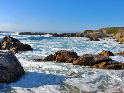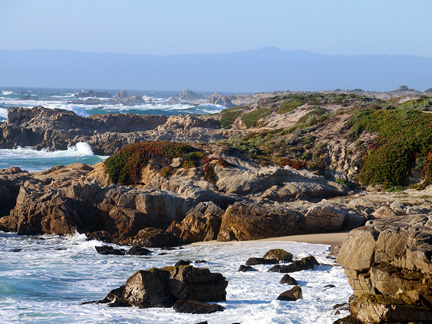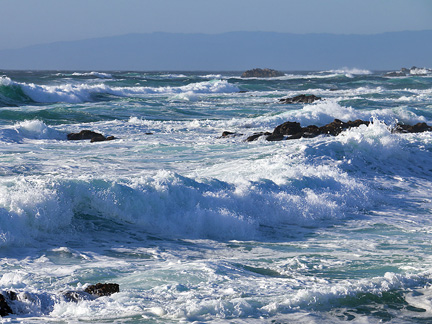 We meandering up and down neighborhood streets in Carmel-By-The-Sea which I could not figure out. There were many small residential houses, expensive shops and motels in trees and on hills scattered all over the place. I found a residential street in Carmel Highlands along the sea, a one lane road on a cliff with multi million dollar houses all of them empty a few looking like they needed some love. Of course the road was made so no outsiders could stop anywhere to take a picture. I just stopped on the road itself to take a few. If someone would have come from either direction they would have had to just wait a minute, lol. Then I ran into two more beaches and parks that would not allow dogs and charged fees. Of course you can guess what I did about that. On the way back I stopped along the beach in Pacific Grove and was simply mesmerized by the beauty. It was as glorious as was Bandon beach in Oregon my favorite beach ever to date. I love being right on ground level in the water while standing on rocks with splashing waves all around me and water flowing up onto the sand behind me with a late afternoon ocean mist.