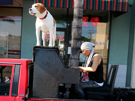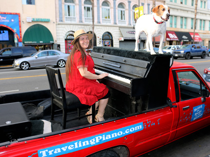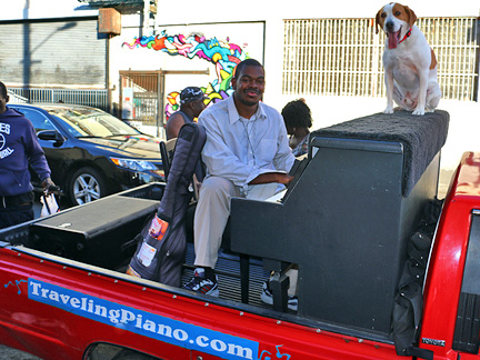 After waking up I finally got around to washing the truck. Today was the first day to play around some in Los Angeles and with all the Traveling Piano dents and rust, etc... the least I could do is wipe off some of the grim that has been building up over time. Jo, Mo and I headed downtown. It poured rain and hailed on the way and all I thought about was how weak the trucks windshield is. There was a Prince tribute concert at city hall we planned on checking out. We got there early on purpose so I could spend some time working with the Traveling Piano. We found a metered parking lot on a street. There was a Mexican bar/restaurant there. I went in to use the bathroom. When I saw the staging area for a band and the dance floor I could see this must be a jumping place at night. Once outside again, before I even got set up an enthusiastic woman approached us saying how cool the Traveling Piano idea was... especially with Mo. Of course I invited her to try it out. That was very nice. What I noticed more than anything else though the course of the next hour was constant smiles from everyone who saw us wether it be on a bus, in a car, walking down the street... one guy who got on to play kept thanking me saying over and over, "I feel so much better, I feel so much better." That had to do with musical empowerment.