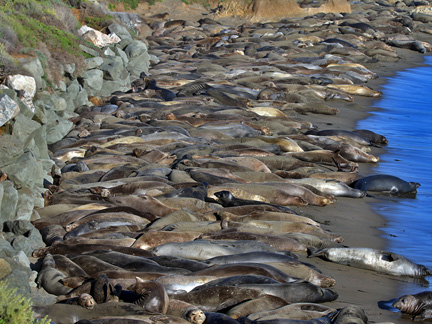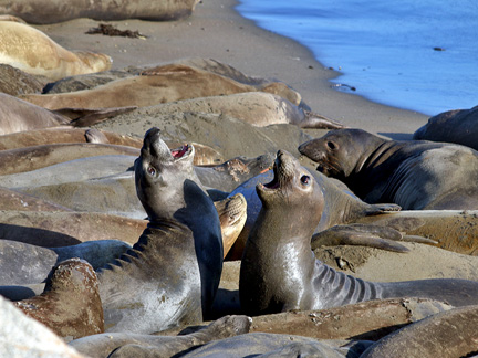 I pulled the truck to a safe spot and shared some music with them. In their twenties, they have six children between them and are very hard working Mexicans... beautiful people and I really appreciate their caring. They... were the blessed people I mentioned above. There was a group of Brazilians who came over to the piano while I was creating music high off a cliff above the ocean and they just would not shut up! Chatter, chatter, chatter... I simply embraced it which led to our all meeting each other which led to some significant Fun, Friendship and Respect! They all got onto the truck together for a picture and... we all just had a great time together. Heading down the road the day was getting late but I did not want to rush. Out of the corner of my eye I saw what looked like large shiny boulders in the sand but somehow they also looked real. Then I saw a sign for an elephant seal lookout. What the...!!! Seals, I wanted to get a picture of seals and to just look see them. Well, it is one thing to go somewhere specifically to have an experience. It is another type of experience to discover. Can we talk awesome??? It was a slumber party with thousands of seals basking in the sun. Like, fifteen feet long seals each, a couple thousand pounds, most were sleeping, some flapping sand over their bodies, others roaring, interacting with each other, moving in and out of the water to eat seaweed... there was only one other time I experienced anything like this it was when I found colony of wild alligators along the road in Florida. This was just so awesome!