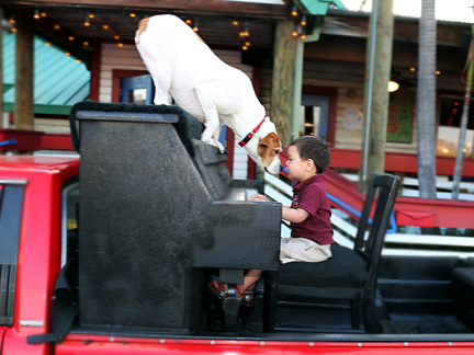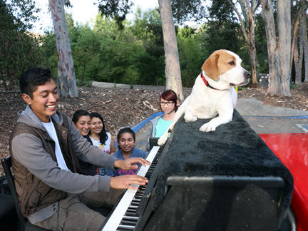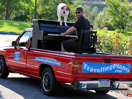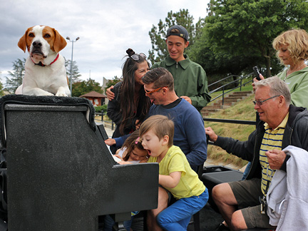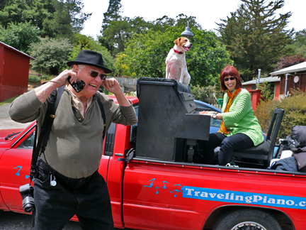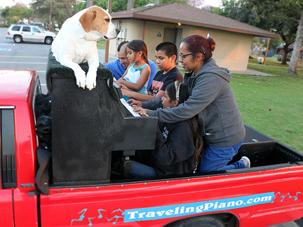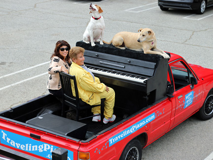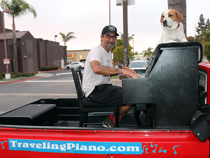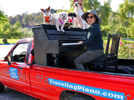 The Traveling Piano went to the dogs today in a La Puenta park! I met a couple who wanted to take a few pictures and along came a woman originally from NYC with her four small pups. They all got onto the piano with Mo for a few musical notes and pictures. Fun! I met another guy from back east and we got into a long personal, psychoanalytic conversation that was probably a little too much for him. It has been a year since I played any stride piano and I've lost about twenty five precent of my physical strength to do it. That is amazing and scary. It takes physical strength to play certain piano pieces of music. Everyday possible I want to exercise to keep my capabilities up as high as possible. Use it or lose it as they say...