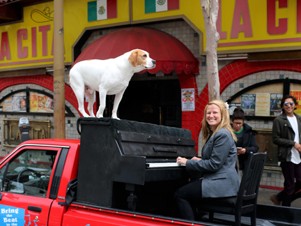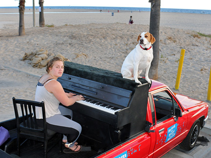 Many people living in the houses here purchased them when the neighborhood was a mess and everything was cheap many years ago. Now with the properties worth a million bucks there are many regular wage earners hoping no one forces them to get their properties assessed because of proposition 13 created back in the 70's that limits the yearly tax to 1% of the value. Those lucky bastards! After awhile we found a dog park and Mo got in some good play. Before the sun set we hit Sunset Strip which is just about as cool and hip as a place can be with the stores, restaurants and varieties of people. I found a parking spot in a popular area on Triangle Plaza. Along with sharing the Traveling Piano it just felt very good to be in such a happening local place with such a good energy. There were homeless people there along with many other types of people but I did not get a feeling they were not welcome, being tolerated or ignored. I am very sensitive to that kind of energy. Feelings of empathy did arise. When I was in Los Angeles last year on skid row for a week sharing the Traveling Piano... well, I'm not going down that road again. Did that done that and now I need to stay unattached... experience some of the healthier energy that Los Angeles provides.