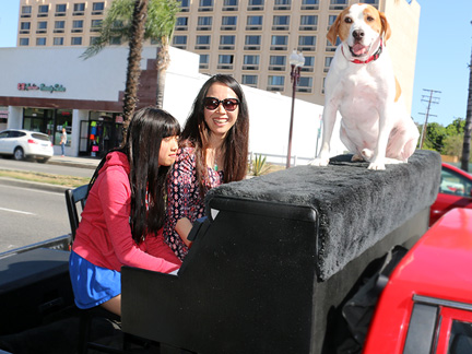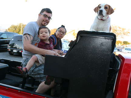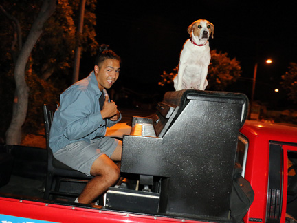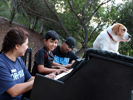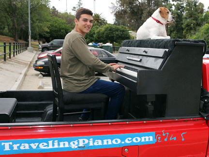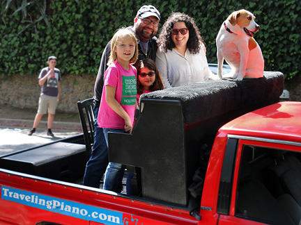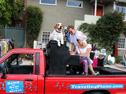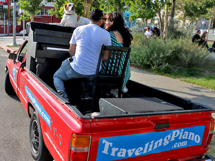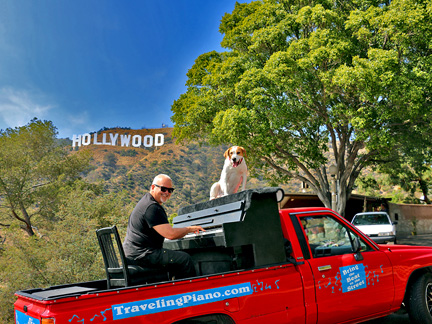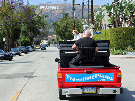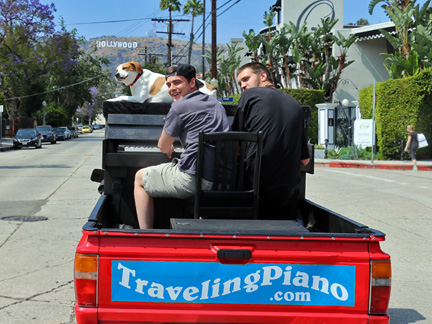 When I woke up I told myself that I have one last day to get the deeds done. After pushing myself through some feelings of defeat and lack of ability I told myself to enjoy the day, relax, no rush, deal with the traffic concerning how ever long it takes to get anywhere and... just do it! After finding the Hollywood sign in the Beechwood section of LA, I simply parked the truck in the center of the street for the best view and asked two guys walking by if they would take some pictures for me. That led to them getting into the Traveling Piano themselves for a music lesson of fun for themselves. The neighborhood was really nice, the kind of place I would enjoy living in. They told me of a neighborhood posting board for apartments up the street. I drove there with no luck but ran into the two guys again and asked if they knew where I could get another good picture with the sign. They jumped into the back of the truck and we all drove there together. On the way we came across some kids with their parents selling lemonade and that led to a Traveling Piano stop off for some fun.