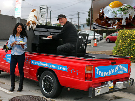 Onward we drove up some super winding steep hills and through street barriers to keep visitors out. You would not believe how many houses are in the hills deep in trees everywhere. I came across a scraggly coyote. At the top a guy sitting with a friend moved his vehicle so I could park the Traveling Piano for a picture. It was the best and most perfect view. Luckily there was a high cement curb that I could back the truck up to so it would not slide down the hill. Without that curb it would never have held. We met a few more people up there. I would never have found that spot without those two kids, nineteen year old Ayrian and Aaron. They got to see me work in action with others and I could feel their appreciation. Deed done. Wow, did that feel good. Onward... to a restaurant called A-Frame in Culver city that serves Hawaiian soul-food with an Asian flair. The place has no sign outside and looks kinda funky, basic but not the prices or quality of food for sure! Luckily, the dish I wanted was is still on the menu. The menu item was called the Loco Moco which is a hambagu steak... a Japanese version of meatloaf sort of... with rice and curry gravy and on-top a sunnyside egg with chives. On the side a most delicious red pickled pearl onion. I was just so happy!