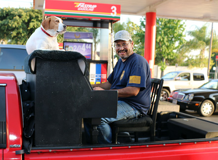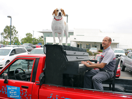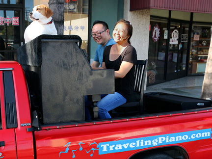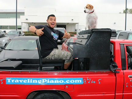 Last night at the car dealer I mentioned the Traveling Piano as it was a Toyota dealer and the Traveling Piano truck is a Toyota with the piano full time in the back for almost thirty years. I told them I would bring it to show everyone tomorrow when we bring in my hosts auto for repair. Then I bit my lip because I only want to share in gratitude. If they were going to put on the new part from the accident without charge that would do the trick. Seeing as I made the offer, of course I had to follow through either way because thats the way I operate. It turned out to be fun, they all loved it and also did not charge for the service... not because of the Traveling Piano but because they are good business people who know how to build loyalty, keep their customers coming back and they know about word of mouth like... this dealership is Puente Hills Toyota and Scott Peterson was the guy who took care of us. The place is so large and hopping with business that is has a Subway sandwich shop inside as well as an automotive store. Selling food in a car dealership? The couple hosting Mo and I, Sergio is from Columbia. Janette originally is from Ecuador. They are American Citizens who have raised two grown sons successfully. Sergio has been working two pizza delivery jobs for twenty two years. Their primary language is Spanish and we both must put out a lot of energy to understand what we are saying to each other. They are so used to glossing over what I say that I need to constantly verify if they understand.
