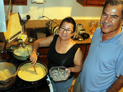 My way of talking, especially with colloquialisms and slang can be confusing and I am not very good at deciphering dialect. Anyway, they are really good people. On the way back after the dealership Sergio stopped at the pizza place where he works and made a pizza especially for me. I knew what is happening would probably happen. I'm doing as I always do. How can I not as I've been doing it for ten years. I keep saying to myself, "your paying money, just go to your room... work, rest, you don't have to spend time, you don't have to interact, you have purchased your privacy, you don't owe them anything, your paying them, that is enough, you don't have to be ultra considerate, etc..." Nada... these people are extending themselves to me. Exchange of money or not and they are kind people, I must get to know them, experience them as much as possible. This is what gives me enjoyment. Today, Sergio made me some Columbian soup with Mexican zucchini (did not know there are different kinds of zucchini) chicken, potato and yucca root. I've never had yucca root before. It is similar to potato and just as tasty. I'm amazed that yucca root has not been a natural part of our diet here in the United States throughout my life. Also, he fixed some corn on the cob flavored with chili powder, lemon, parmesan cheese, salt and of all things... mayonnaise. That seemed very strange to me. The taste at first I thought strange... that transitioned into different... and then, really good!