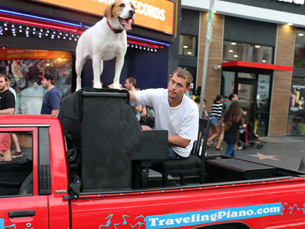 It was not until three in the afternoon before I was able to push my ass out and drive to Hollywood Boulevard in the center of Los Angeles. On the way I just kept telling myself I would feel ok about everything as long as I kept my focus on Fun, Friendship and Respect. Keep the agenda pure and don't try to "work" the streets. When I got there it was just amazing how everything worked with perfect timing. It took about five synchronistic quick moves to find a great parking spot a block from Jimmy Kimmel's theatre. No parking is allowed on that block. We were outside the church of Scientology. Members were working the streets the entire time handing out pamphlets... not a very warm feeling bunch of people thats for sure but they were polite. The first person I met with the Traveling Piano was one of Howard Stern's wack pack crew. He got onto the truck and was very creative and funny. As he improved a song about being Jewish and cat calling girls walking by, his main focus was how Trump is his man. The delivery was strong and convincing but... I thought he just had to be spoofing! When I got back to where I am staying I looked him up to find he wasn't spoofing! He's an actual Trump maniac. I'm an actual Anti-Trump maniac.