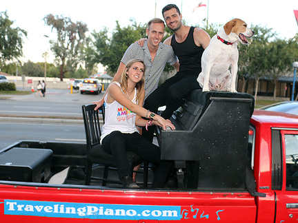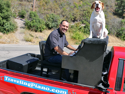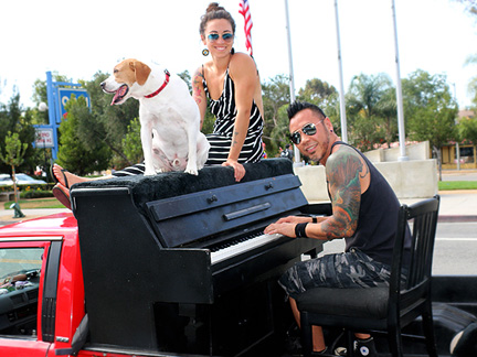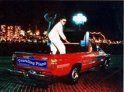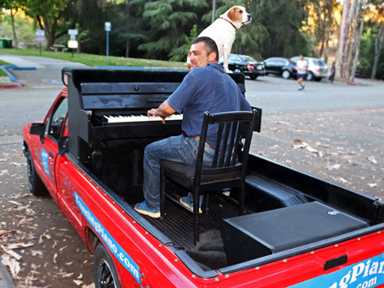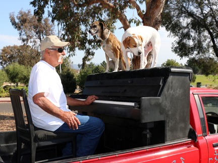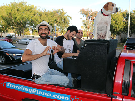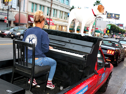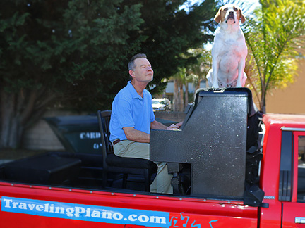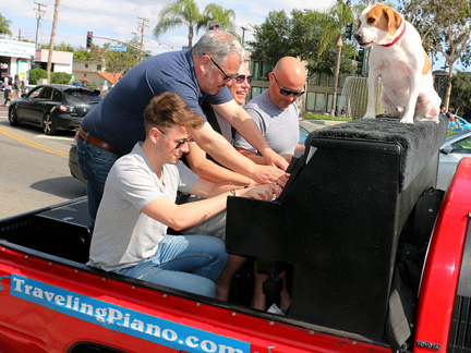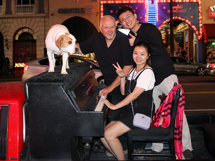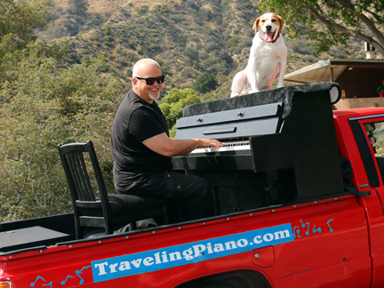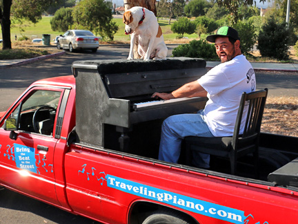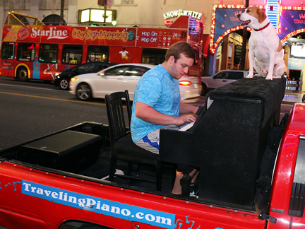Afterwards I was wiped out but Al was still game to drive me around so we hit up Melrose Avenue, a very hip place for sure. I created music while being driven up and down the street until I just had to stop from exhaustion. Rush hour had began and I was going to join it to get back to where we are staying but decided to check out more of Melrose Avenue and ended up in West Hollywood. I found a perfect parking spot right outside a trendy outdoor cafe that was pretty crowded. While trying to feel the place out for the Traveling Piano I sat with a cup of coffee. There was a lot of Hollywood wheeling and dealing going on as well as people just wanting to be seen. When I pulled up and parked the truck with Mo in the cab, that caught everyone's attention big time. Getting onto the piano to play would have felt too intrusive to me and I preferred to leave everyone with a sense of intrigue and aloofness, ha. Was I too chicken? Naa... it just didn't feel right. If someone had initiated some direct curiosity then it would have happened but people in places like that are so careful about seeming intrusive themselves. The rush hour traffic out of there was brutal! As I drove down the center of Hollywood Boulevard on the Traveling Piano creating music today I had to tell myself, "Your driving down Hollywood Boulevard right in the center of everything playing the piano!" I did that once each time we did it. Was it fun? Shit yea, but it was work fun. There was little abandonment in it because of too many things to think about that could have gone wrong. Being sixty years old might be a factor with that. Still, it was a kinda crazy thing to do and I'm glad I can still do crazy things without being "allowed" by anyone else but myself. Al being with me really helped make it fun.