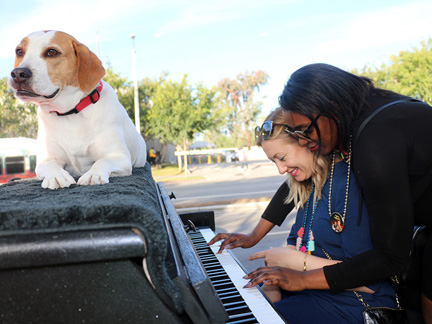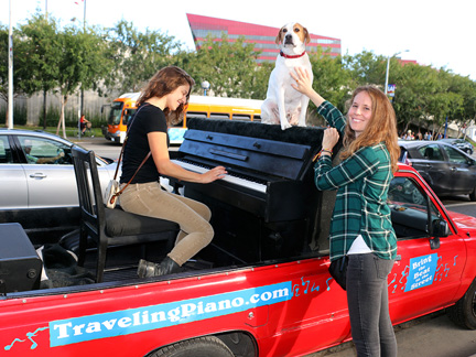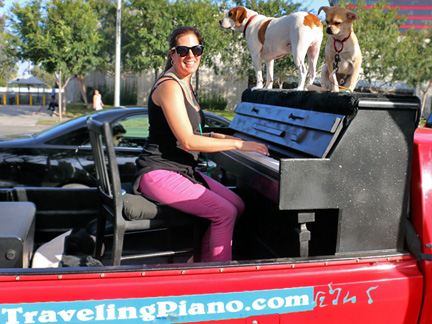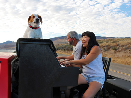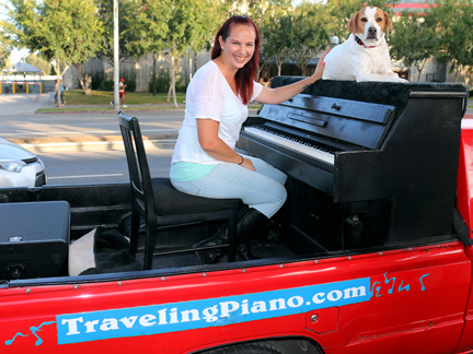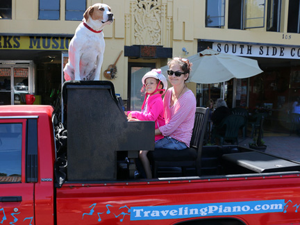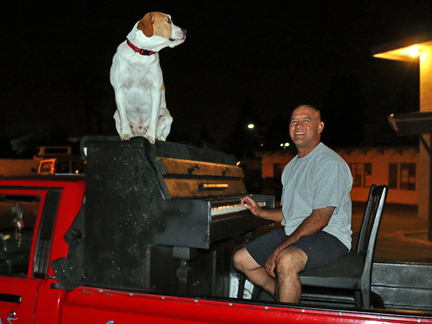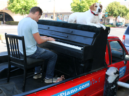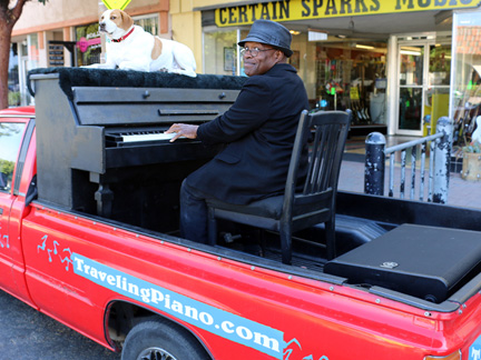 There is a coffee house and music store on a street corner downtown that I've been eyeing as a place that might fit for a Traveling Piano stop by and so Mo and I drove there for a cup of coffee. Its a busy little spot, a small hub of local interaction with parents and kids arriving for music lessons, people just stopping in for a cup of coffee to take out, eat a sandwich, hang out for a short spell. I just sat and waited for people to become interested. It took a little while but it happened. My interactions I don't write about so much anymore, how many times can I say the same thing over and over? I mean its all great but I don't want to become too redundant. Ha, wish I could follow that line of thinking when it comes to communicating negative aspects of what has been going on with money, a home base, etc... People were more interested in Mo than the fact that there was a piano on the back of a pickup truck and that he was sitting on top of it. The music store had a grand piano which I played on for a few minutes and that felt good playing on a real piano. I'm really hanging by a thread with this journey but am determined to play it out until I don't.
